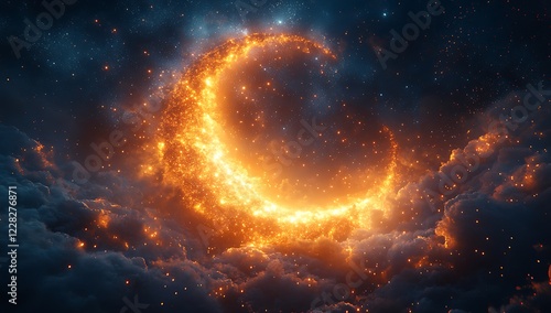 © Micro, Fototapeta premium Glowing Celestial Crescent Formed by Stars Amidst Clouds in Deep Blue Night Sky