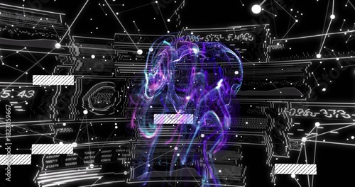 © vectorfusionart, Fototapeta premium Glowing central brain-shaped nebula floating in virtual 3D space, with node network and data panels