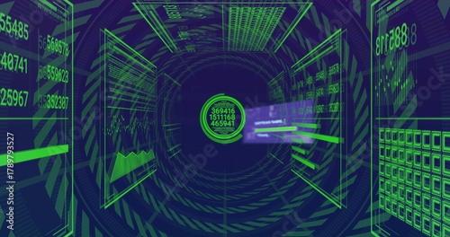 © vectorfusionart, Obraz premium Glowing central data node pulsing in virtual 3D tunnel, displaying holographic panels and numbers