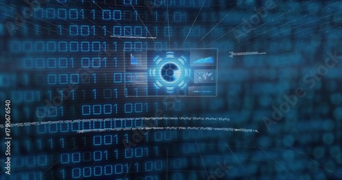 Fototapeta premium Glowing central HUD displaying rings and floating panels in cyberspace amid binary arrays