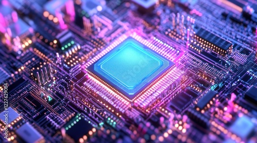 © berkah, Obraz premium Glowing chip in circuit board closeup, background of wires, tech use