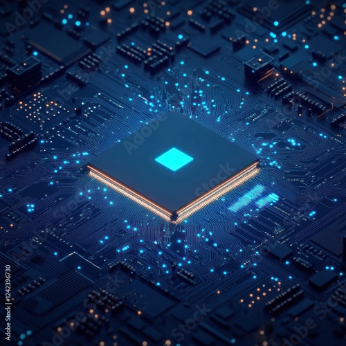 Fototapeta premium Glowing chip on circuit board with many paths, usable for tech, AI, and...