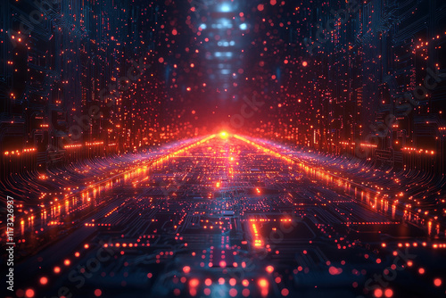 © AbdulHakim, Fototapeta premium Glowing circuit board data stream with particles in cyberspace background
