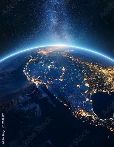 Obraz premium Glowing cities illuminate the dark side of Earth from the vastness of space....