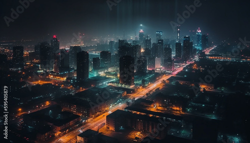 © Stockgiu, Fototapeta premium Glowing city skyline at dusk, bustling nightlife generated by AI