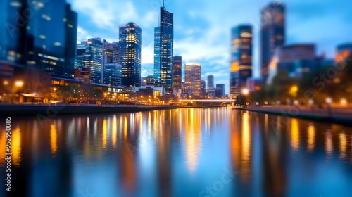 © pisan thailand, Obraz premium Glowing City Skyline at Dusk Reflecting on Tranquil River with Towering Skyscrapers