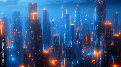 © NUR, Fototapeta premium glowing city skyline at night, neon lights reflecting on glass buildings