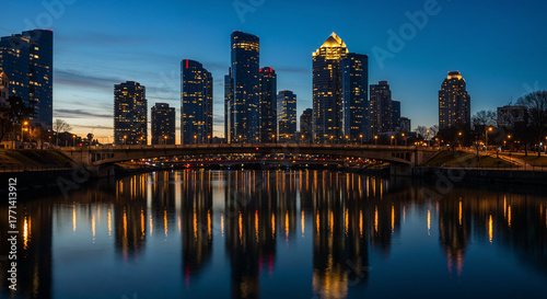 © abu, Obraz premium Glowing city skyline reflected on river at dusk with cinematic tones.