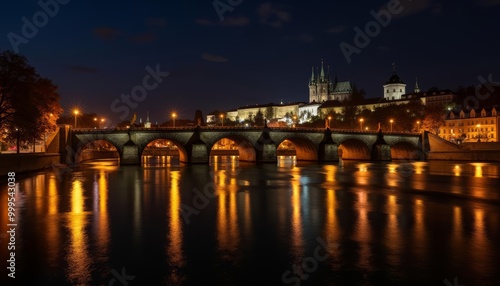Fototapeta premium Glowing cityscape at night illuminated bridge over calm river