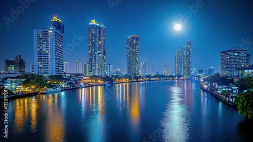 Obraz premium glowing cityscape at night with skyscrapers reflecting on calm river under bright moonlight
