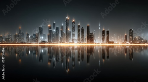 Naklejka premium Glowing Cityscape Reflecting on Water at Night with Sleek Contemporary...
