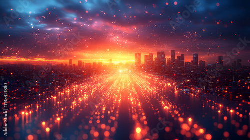 © Dodoodle, Fototapeta premium Glowing Cityscape Sunset With Energetic Light Trails