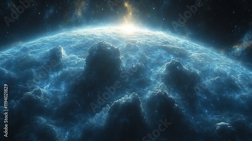 Fototapeta premium Glowing cloudscape on an alien planet, sunrise, space, cosmic.