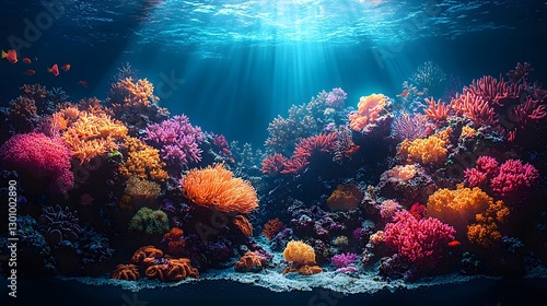 © Bussakon, Fototapeta premium Glowing Coral Reef Teeming with Vibrant Marine Life Under Clear Blue Ocean Waters