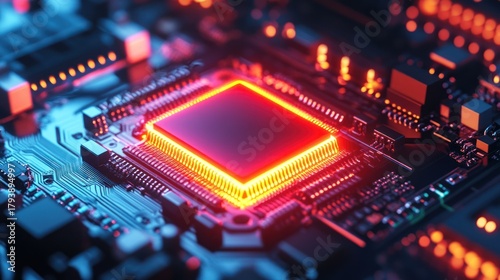 © MBRAMO, Fototapeta premium Glowing CPU on Circuit Board; High-Tech