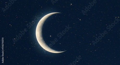 Fototapeta premium Glowing crescent moon illuminates the vast, dark night sky filled with numerous distant stars