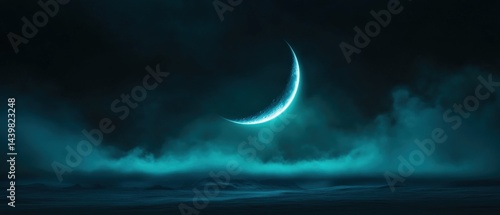 © Priya, Fototapeta premium Glowing crescent moon over misty landscape
