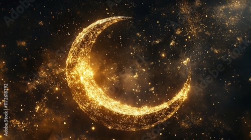 © Abdul, Fototapeta premium Glowing crescent moon with ornate lanterns in a dark forest.