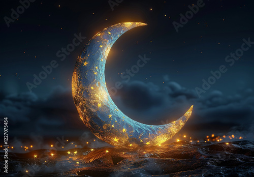 © Designify, Fototapeta premium Glowing Crescent Moon with Stars Against a Night Sky