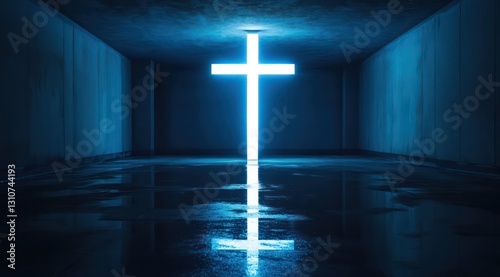 Naklejka premium Glowing cross in dark, wet tunnel; faith, hope, spiritual journey