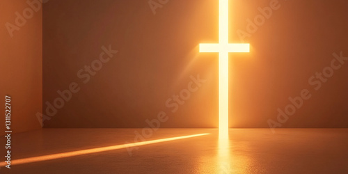 Naklejka premium Glowing Cross in Minimalistic Interior. Modern Christian Symbol of Faith and Spiritual Light for Religious Designs, Church Backgrounds, and Sacred Easter Concepts.