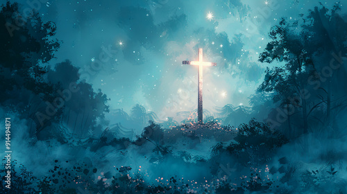 Naklejka premium Glowing cross religion hope faith christianity spiritual forest dark night mystical nature landscape god jesus christ belief symbol heaven scene background light divine holy peaceful illustration art