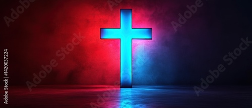 © Ali, Obraz premium Glowing cross symbol against a red and blue illuminated background.