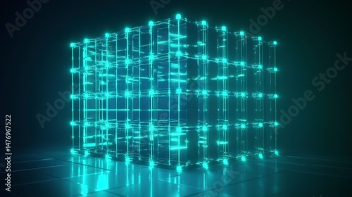 Fototapeta premium Glowing cyan cube structure with interconnected nodes, reflecting on a dark...