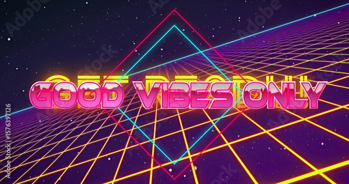 © vectorfusionart, Naklejka premium Glowing 3D GOOD VIBES ONLY text hovering in neon grid under stars, with two-color diamond shapes