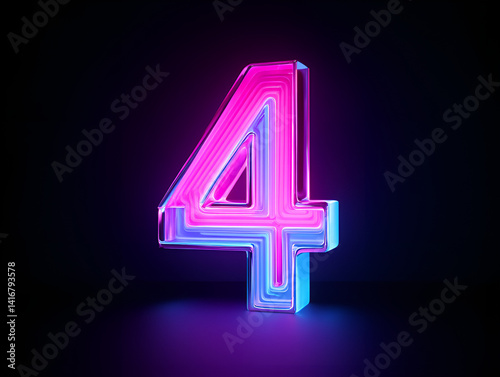 Obraz premium glowing 3D number "4", lit by alternating pink and blue neon strips, set in a...