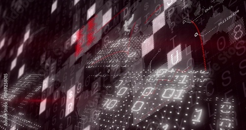 © vectorfusionart, Fototapeta premium Glowing data wall moving in data corridor, showing binary and alphanumeric characters, tiles