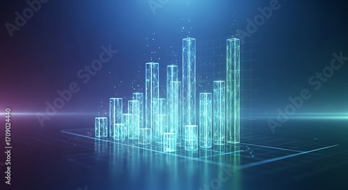 Fototapeta premium Glowing digital bar graph rises from a reflective surface, showcasing data...