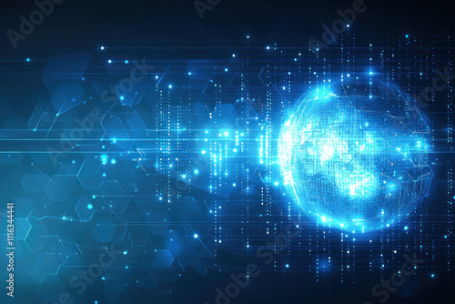 © Fiva, Obraz premium Glowing digital globe with data streams and hexagons.