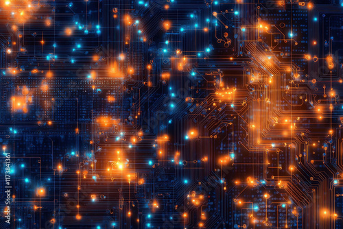 © Image Tree, Obraz premium Glowing digital grid with vibrant blue and orange nodes in a futuristic design