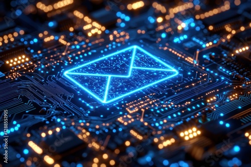 © Rangga Bimantara, Obraz premium Glowing digital mail icon on circuit board with blue and orange light effects