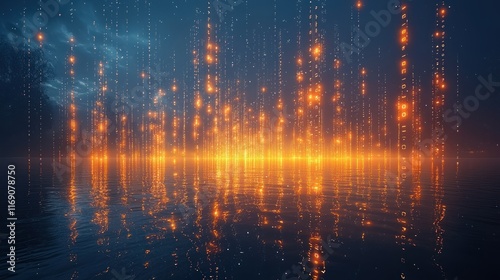 Fototapeta premium Glowing digital rain over a tranquil water surface.