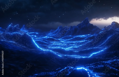 Fototapeta premium Glowing digital seascape with luminous waves under a dark sky during twilight