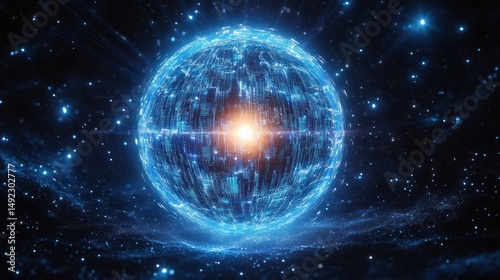 Obraz premium Glowing digital sphere surrounded by blue light particles in a dark space...