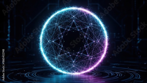© bull stock, Obraz premium Glowing digital sphere with interconnected lines and particles on dark background