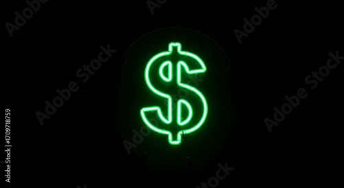 Fototapeta premium Glowing dollar sign green neon light effect isolated on black background for financial and business concepts
