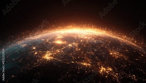 Obraz premium Glowing Earth at night, illuminated city lights and network connections forming a web across the planet, set against the dark backdrop of space