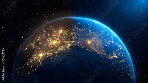© Sujito, Fototapeta premium Glowing Earth Globe Displaying Cities Lights And Cloud Formations Within The Vastness Of Space During Night