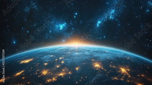 Fototapeta premium Glowing Earth in deep space with stars, illuminated global view from orbit,...