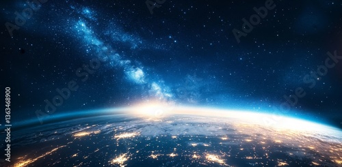 © kkkiim graphic, Obraz premium Glowing Earth in Space at Night with Stars and Blue Gradient Sky