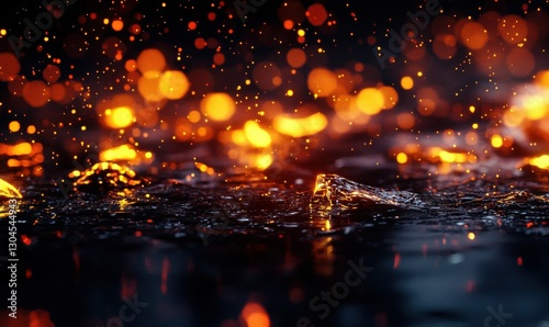 Fototapeta premium Glowing embers scattered on dark surface with blurred fiery lights.