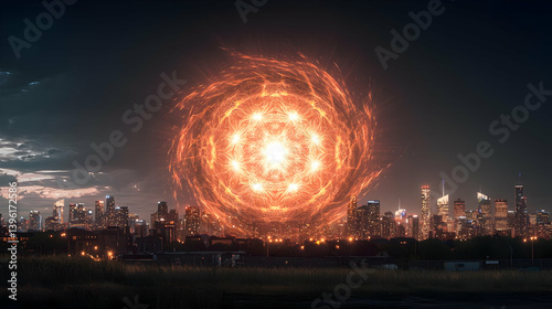 © artzone, Fototapeta premium Glowing Energy Orb Over Night Cityscape