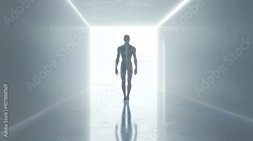 Fototapeta premium Glowing Enhanced Human Standing in Minimalist Futuristic Environment