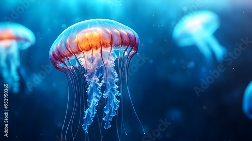 Fototapeta premium Glowing Ethereal Jellyfish Drifting in Mesmerizing Deep Blue Ocean Underwater...