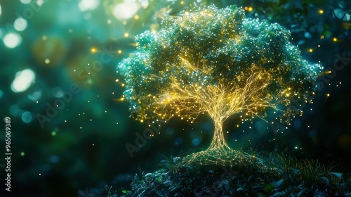 Obraz premium Glowing Ethereal Tree in Fantasy Forest Landscape with Shimmering Bokeh Lights