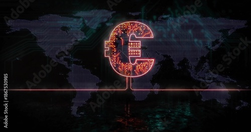 Fototapeta premium Glowing euro mic emblem projecting circuitry on cyber stage with dotted world map and red bar